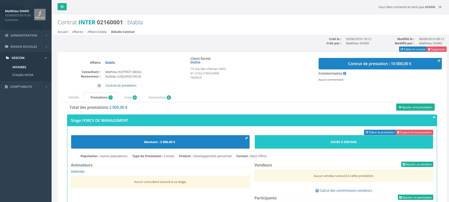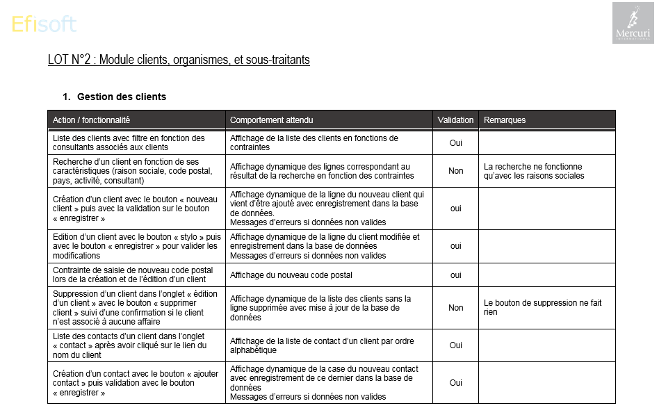 La société MERCURY INTERNATIONAL a mandaté EFISoft afin de faire la refonte de leur application de gestion commerciale. Le périmètre de cette application s'étend à la gestion des clients et prestataires, mais aussi la facturation et l'édition des tableaux de bords commerciaux.