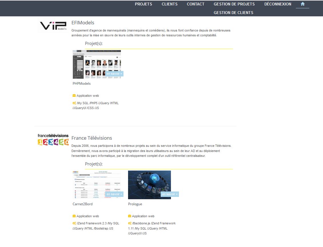 Start-up spécialisée dans le développement web d'applications métier, sites Internet managés, CMS, intranet, extranet ou encore Internet mobile dans de nombreux secteurs d'activités (production télévisuelle, services à la personne, mannequinat, immobilier d'entreprise etc.).